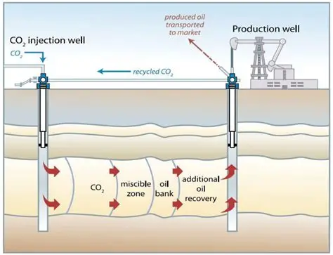 Miscible Gas Flooding: This EOR technique utilizes miscible gases, typically carbon dioxide (CO2), which can mix with the oil at reservoir conditions. The injected gas reduces the oil’s viscosity and allows it to flow more easily. Additionally, CO2 flooding can have the added benefit of acting as a form of carbon capture and storage (CCS) as the injected CO2 remains trapped underground. However, miscible gas flooding is highly dependent on reservoir pressure and oil properties for successful mixing to occur.