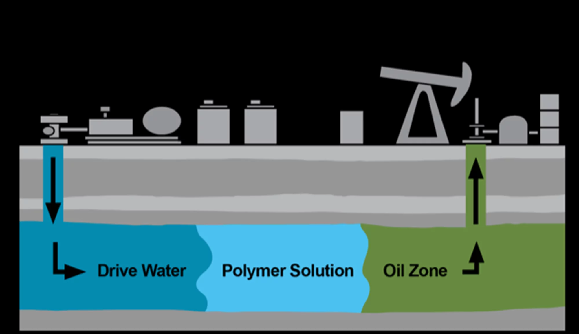 3. Chemical injection, which can involve the use of long-chained molecules called polymers to increase the effectiveness of waterfloods, or the use of detergent-like surfactants to help lower the surface tension that often prevents oil droplets from moving through a reservoir.