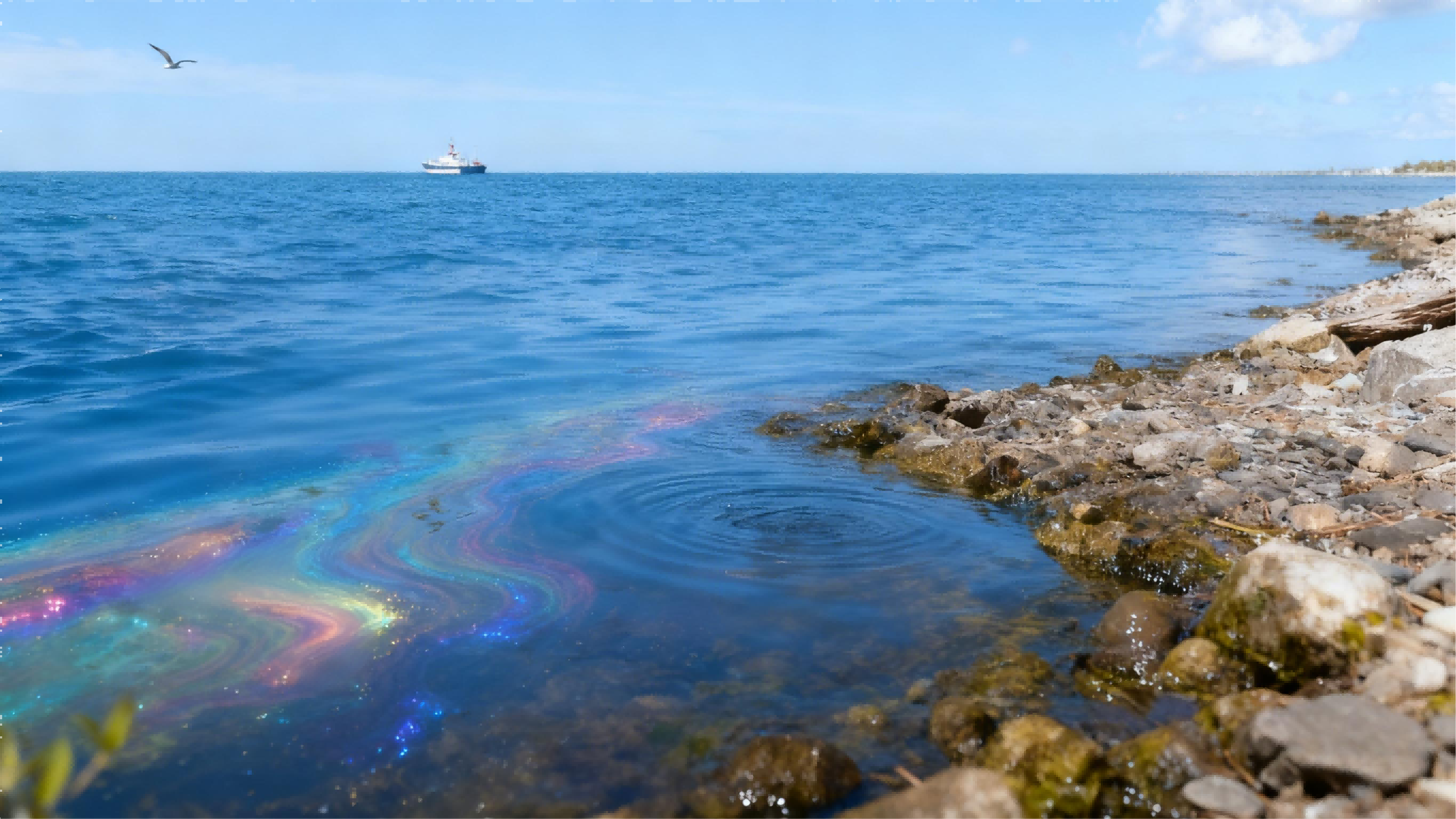 Once petroleum enters the water, it doesn’t mix with the water because it’s lighter and doesn't dissolve in it. Instead, it floats on the surface, spreading out quickly and forming a thin film. This film can block oxygen from entering the water and disrupt the ability of aquatic plants to photosynthesize. As the petroleum breaks down naturally, it also uses up large amounts of dissolved oxygen, causing the water to become hypoxic (lacking oxygen), which can lead to the water turning black and smelling bad.