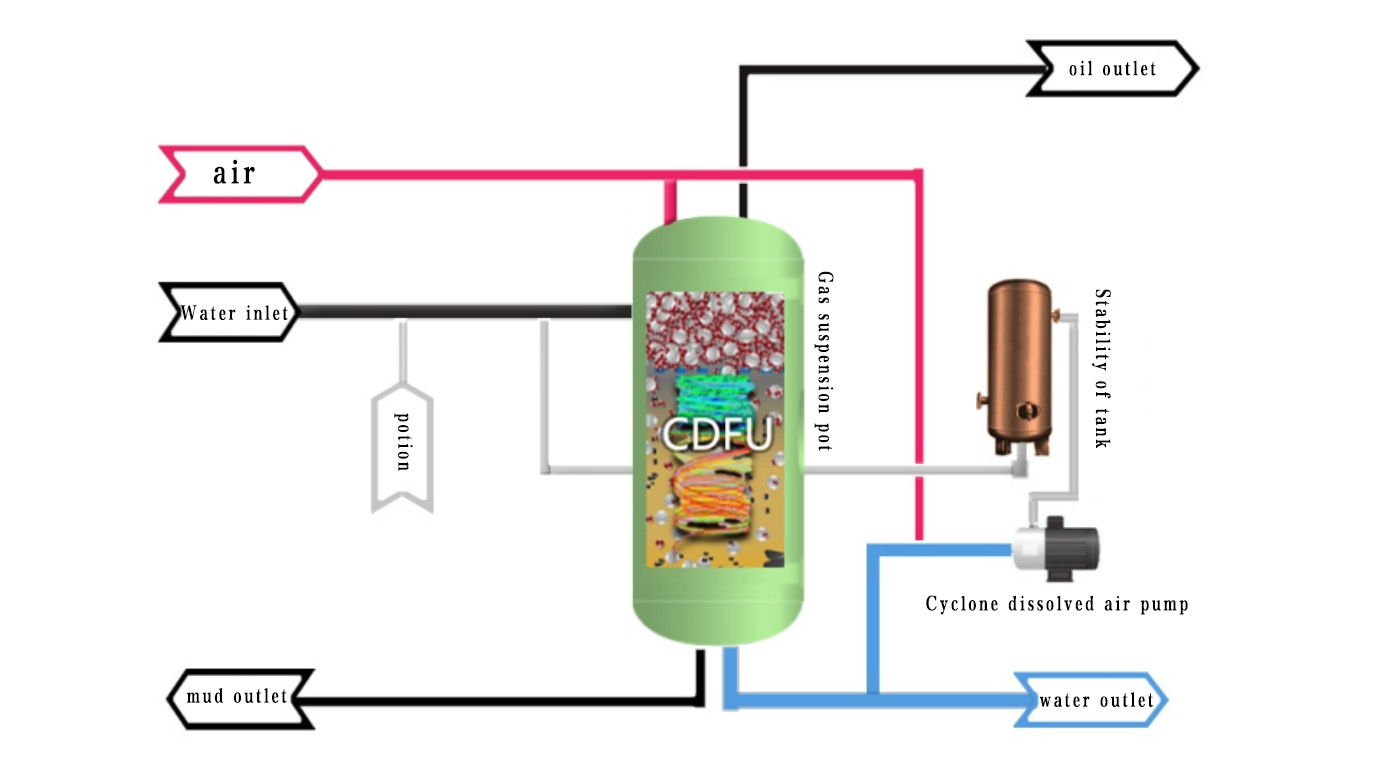 CDFU(Cyclonic Dissolved Gas Flotation Unit) is a patented technology independently developed by our company. It effectively combines centrifugal separation technology, dissolved air flotation (DAF), and ultra-fine bubble generation technology to achieve highly efficient separation of oil and suspended solids from wastewater. Key features include: